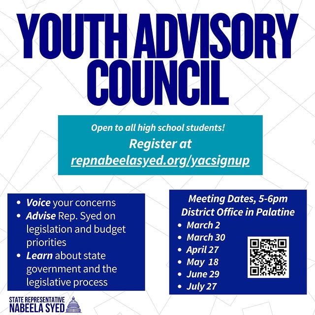 Visit repnabeelasyed.org/youth-advisory-council to read testimonials from past YAC students and to register for updates about upcoming meeting dates. Our introductory meeting is on Monday, March 2! Stop by and learn about the Youth Advisory Council's mission, the projects we'll work on throughout the year, and how students can get involved in the District 51 Fellowship Program.  If you or someone you know are interested in civic engagement, leadership, and making a community impact, we hope we'll see you there!